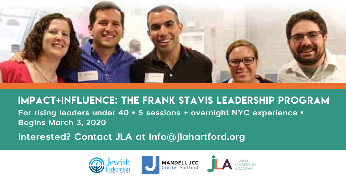 We are excited to re-introduce the highly successful Frank Stavis Leadership Forum under a new name for a new generation. Introducing…..Impact + Influence: Frank Stavis Leadership Program (I+I), a five session program designed for rising leaders under age 40 who want to leave a lasting impact on the Jewish community. The program is a collaboration between Jewish Federation of Greater Hartford’s Jewish Leadership Academy and the Mandell JCC. Over the course of five sessions, participants will explore a variety of issues that the Jewish and global communities face today. I+I will additionally include overnight immersive leadership experience in Manhattan.