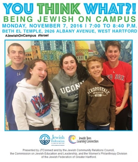 “You Think What?! Being Jewish on Campus” brings 11th and 12th graders and their parents together with experts in the field for a deeper conversation about what it means to be Jewish during these formative years. The program will take place Monday, November 7, 2016, from 7:00 to 8:40 P.M. at Beth El Temple, 2626 Albany Avenue, West Hartford. It will feature Café Dilemma, a teens-only conversation with a professional young adult facilitator; a parent discussion with Stephanie Hausner, Director of Community Strategy for IAN – The Israel Action Network; and a panel presentation by local college students.